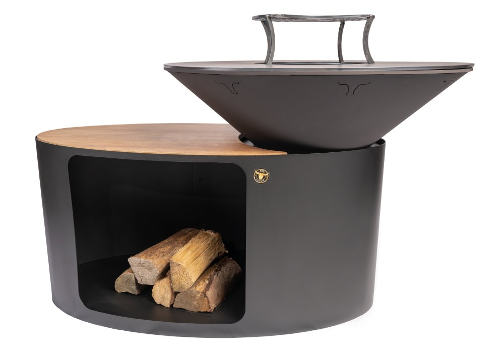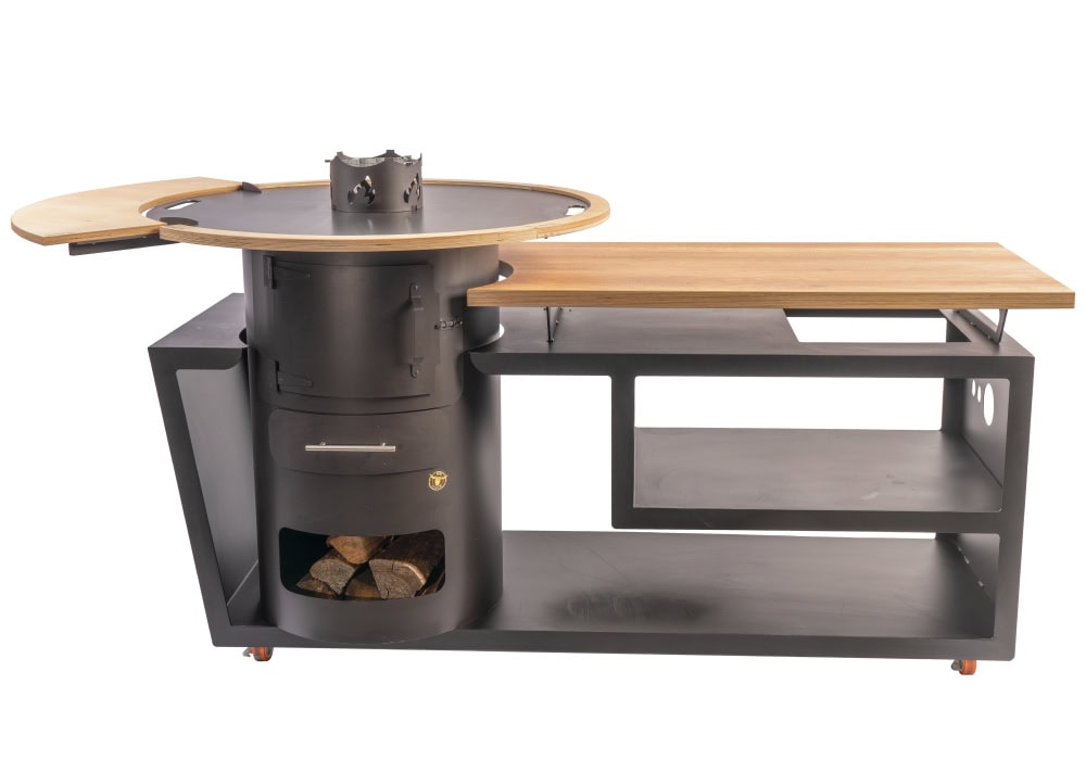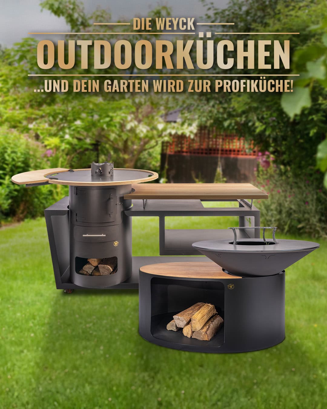 De FireWeyck is onze kleinste mobiele buitenkeuken en biedt een vuurschijf met een diameter van 85 cm of 100 cm. Naast het grillelement bevindt zich op het ovale oppervlak een hoogwaardige houten plaat die uitstekend geschikt is als werk- of afzetvlak.